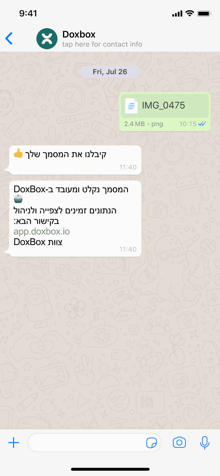 With Doxbox, forwarding an invoice from WhatsApp takes seconds - no waiting, no reminders later.